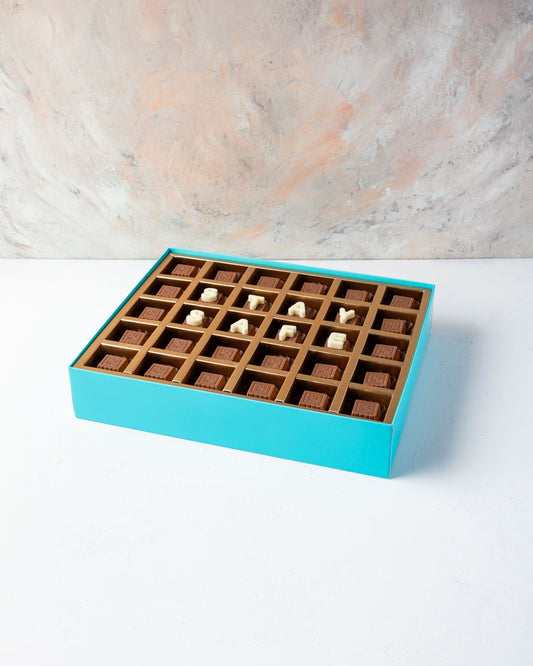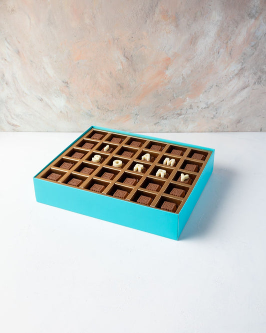 YOUR GIFT CONTAINS Approx. 500 grams pure Belgian milk chocolate Text: 6 / 12 letters with 6 letter in in each row Flavors: Pure Belgian Milk chocolate Box dimensions: LxBxH: 31×25.5x6cm HANDLING AND STORAGE Keep away from direct heat and sunlight All our products are made to order and we...