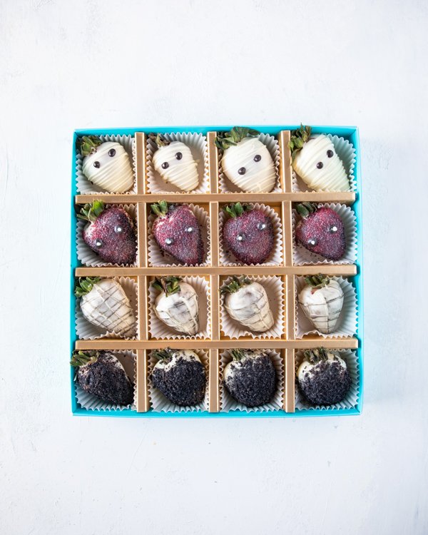 16pcs dressed-up strawberries, dipped in colored chocolate and Dark chocolate. Hand designed, decorated with edible glitter